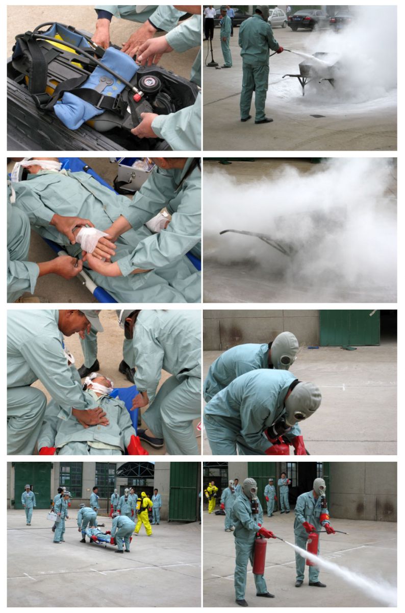 由于生產(chǎn)所需原料有易燃,含毒的特性,我公司定期舉行消防,以及急救的演習(xí)。演習(xí)內(nèi)容包括對起火源的處理,人員的疏散,火勢控制,中毒人員的急救及轉(zhuǎn)移等。