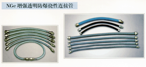 我廠生產(chǎn)的NGe增強透明防爆撓性連接管、防爆標(biāo)志、ExeII防爆合格證號CE001140它除具有同類產(chǎn)品的性能之外,還具有外形美觀、耐用、可撓性好、結(jié)構(gòu)牢固可靠,軟管兩端為鋼制螺紋活接頭,兩端為壓口,表面鍍鋅或鍍鉻。軟管長度與接頭螺紋可根據(jù)用戶要求制作。